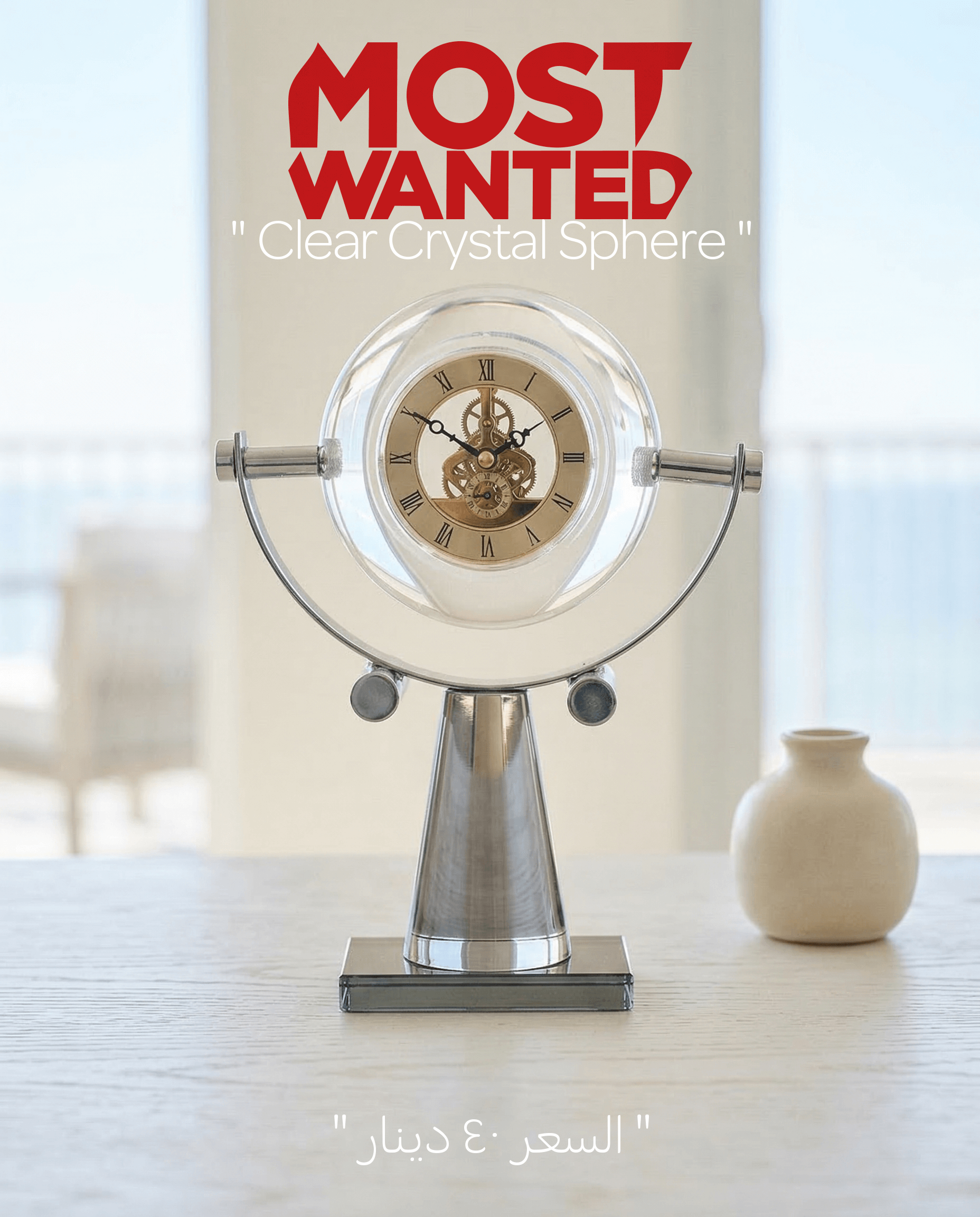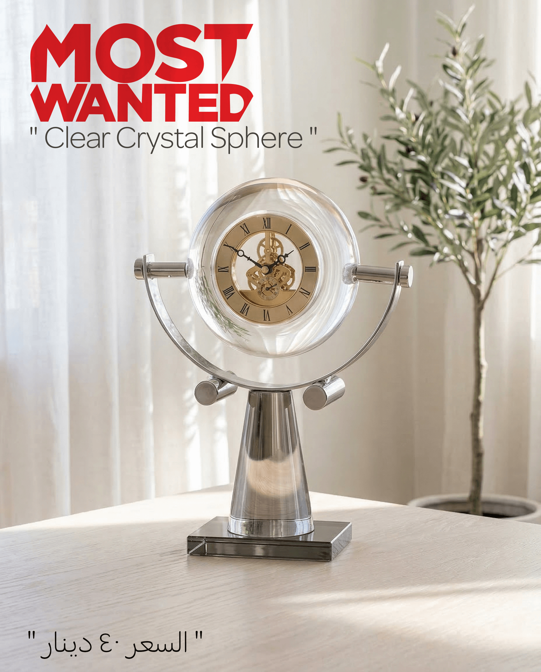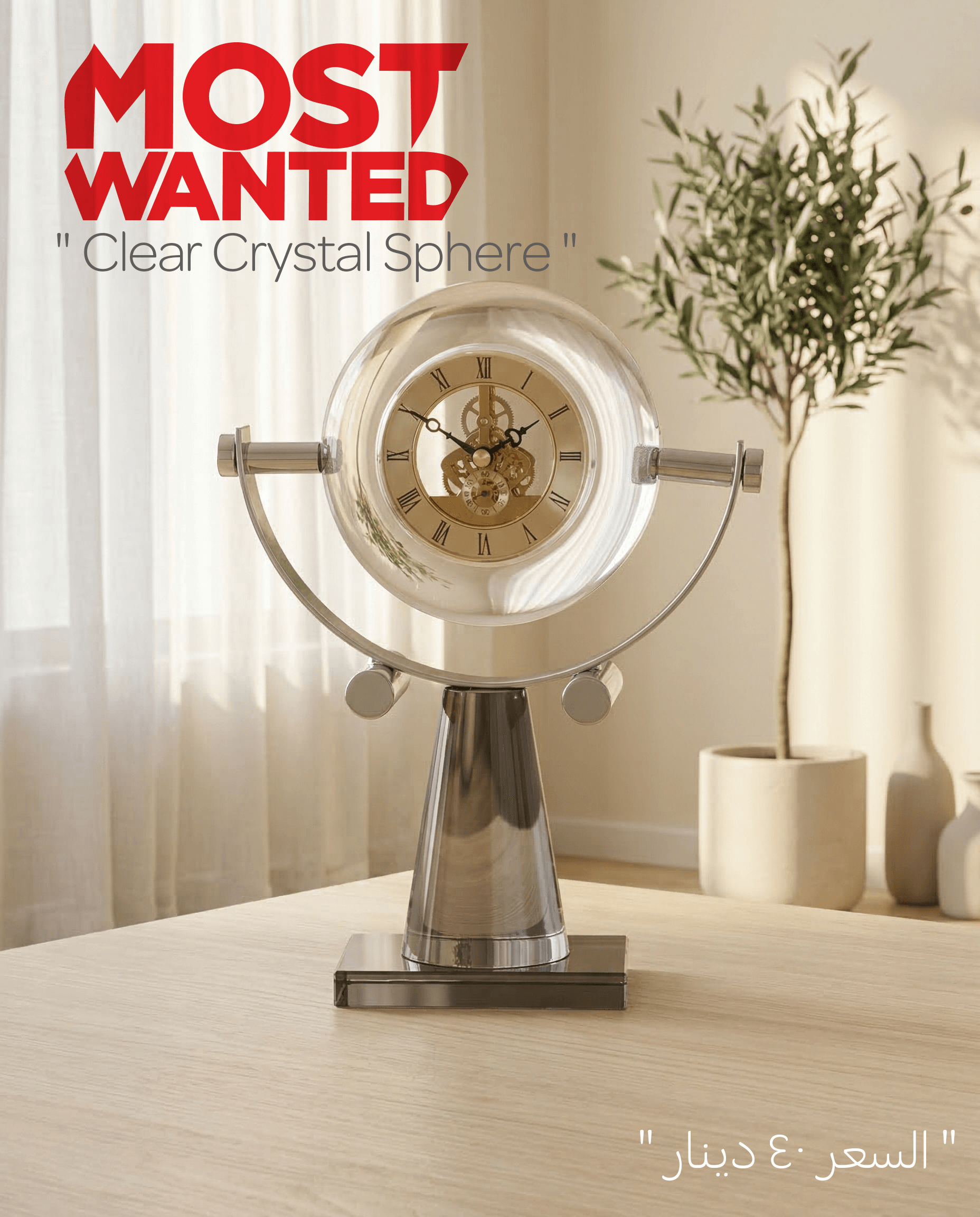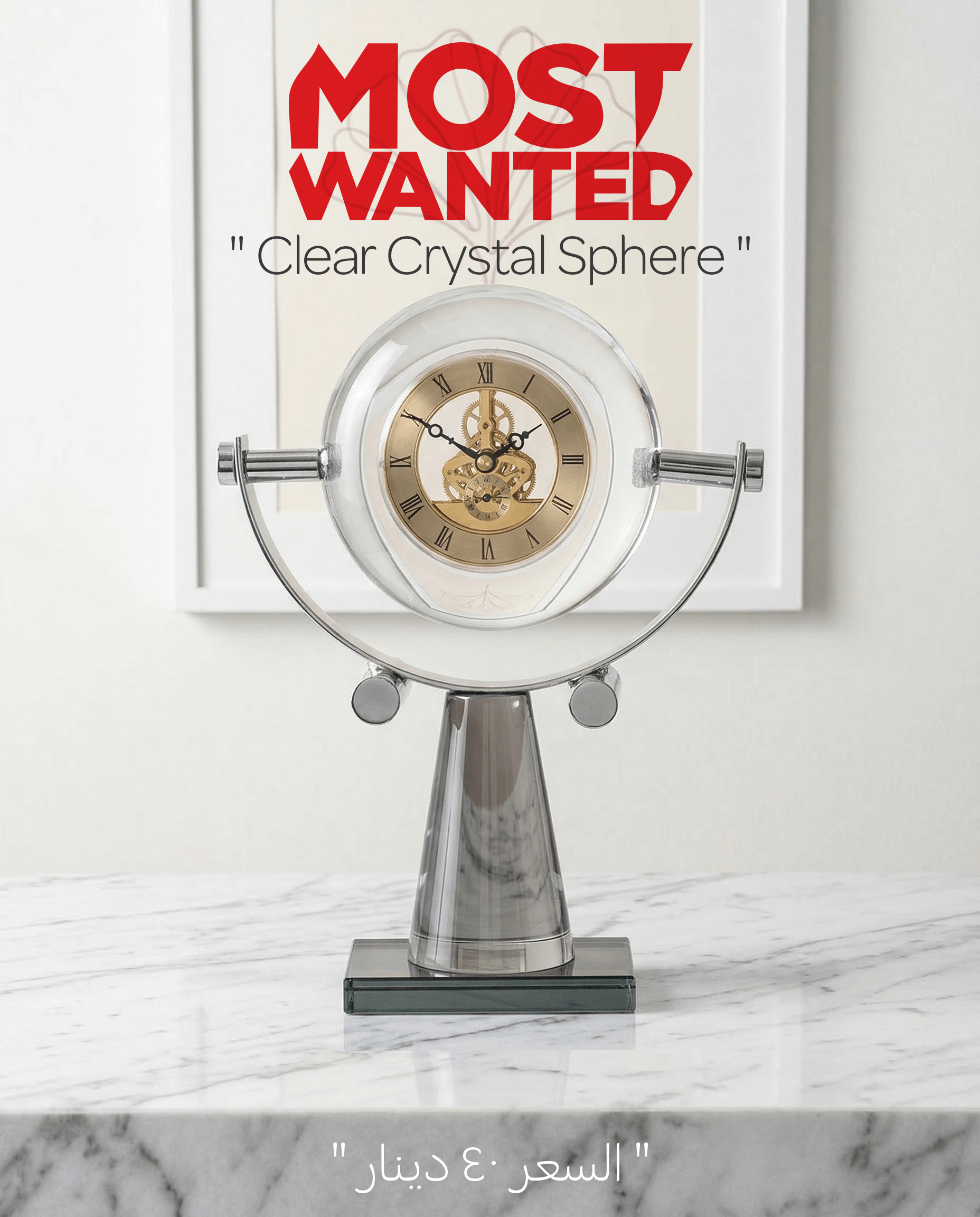 ارتقِ بمستوى مكتبك أو غرفة المعيشة مع القطعة الأكثر طلباً Most Wanted. ساعة المكتب الميكانيكية بتصميمها الكروي الشفاف، تمنحك فرصة رؤية “قلب الزمن” بلمسة فنية تجمع بين لمعان الفضة ونقاء الكريستال وبريق الذهب.