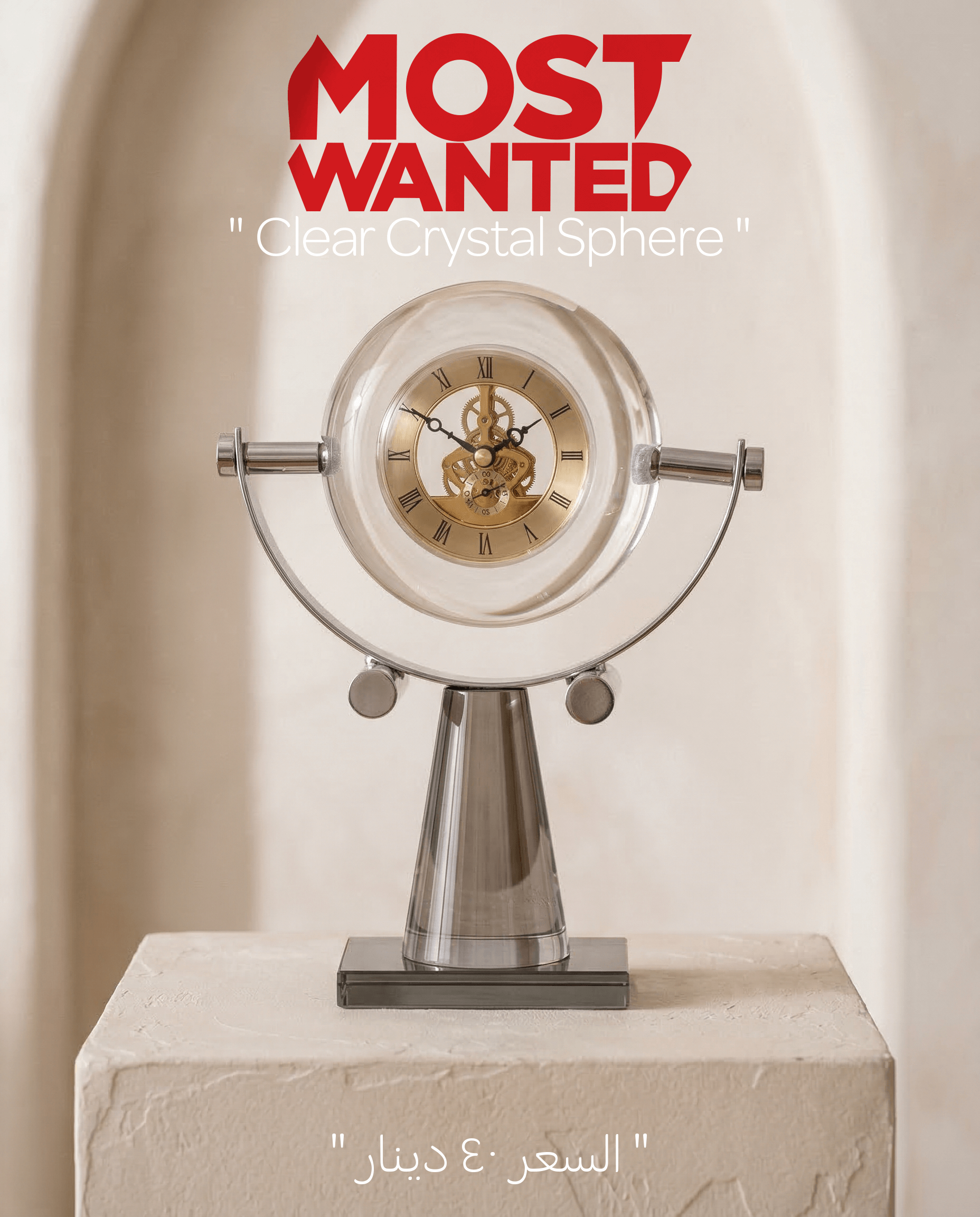 تتميز مجموعة “Clear Crystal Sphere” باتباع نمط الـ Modern Industrial Luxury. الساعة مصممة بجرم زجاجي ثقيل ومصقول على شكل كرة كاملة، مثبتة على ذراع معدني انسيابي وقاعدة فضية مرتفعة. ما يميز هذه المجموعة هو إمكانية تنسيقها مع طاولات السيراميك الخاصة بنا المتوفرة بـ 3 أنماط مختلفة (رخامي، حجري، ومنقوش)، مما يمنح العميل حرية بناء زاوية ديكور متكاملة تعكس الفخامة الهادئة (Quiet Luxury).